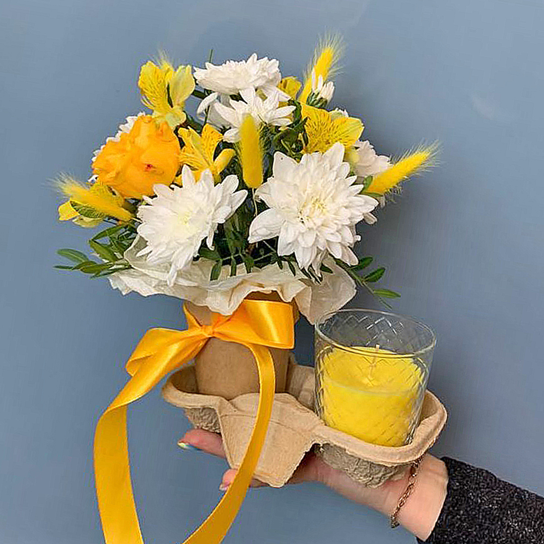 Такой небольшой букет подойдёт, чтобы порадовать коллегу, сделать сюрприз подруге или преподнести в знак благодарности. Он легко впишется в рабочий кабинет, создаст уют на письменном столе или в гостиной. А запах от аромасвечи наполнит комнату приятным ароматом.